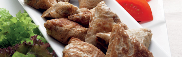 تدهن هذه المثلثات بالزيت وتخبز في الفرن حتى تصبح هشة أو تقلى في الزيت الساخن حتى تصبح وردية اللون.